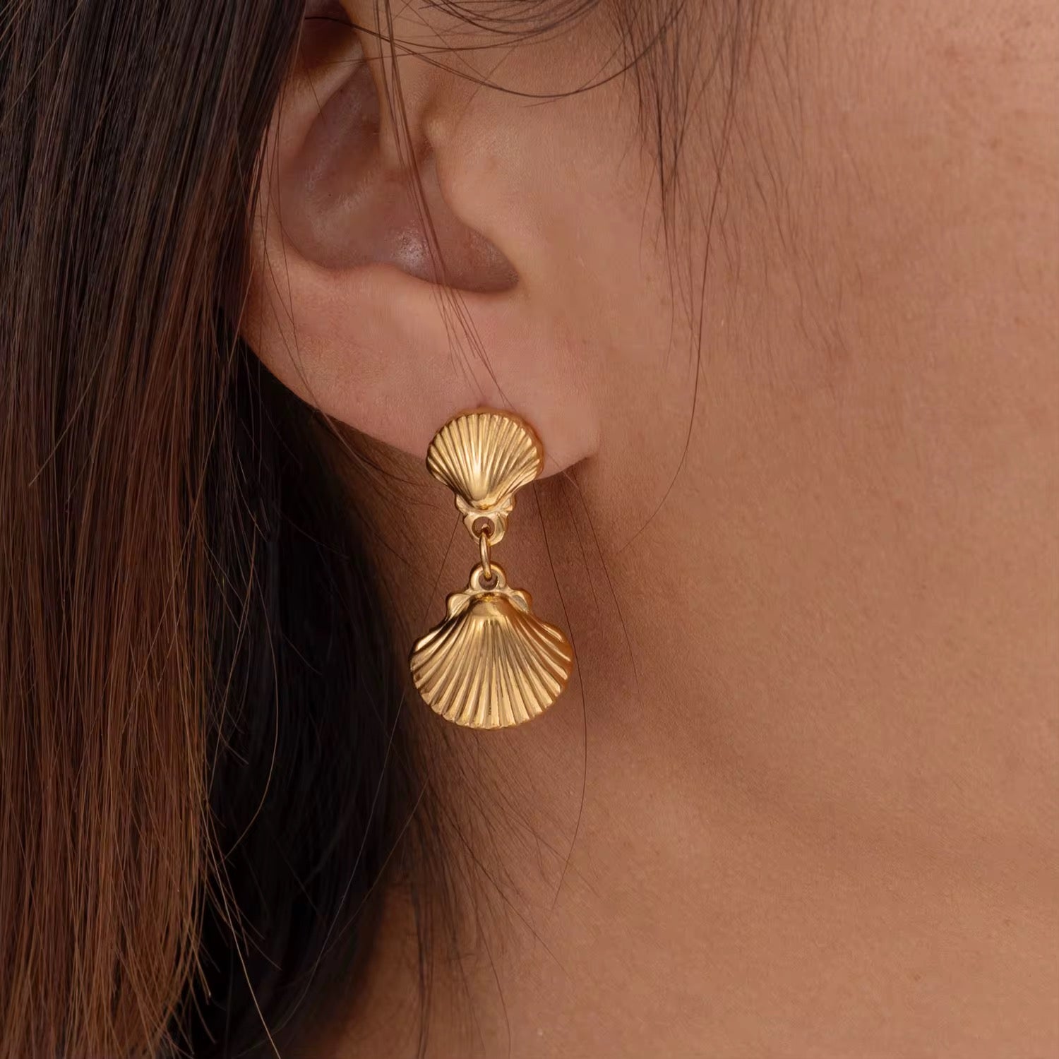 Bring a touch of coastal elegance to your everyday look with these shell-inspired stud dangle earrings, crafted from high-quality stainless steel and finished in radiant 18K gold PVD plating. Featuring a detailed shell design that delicately sways from a minimalist stud, these earrings offer a blend of seaside charm and modern sophistication.