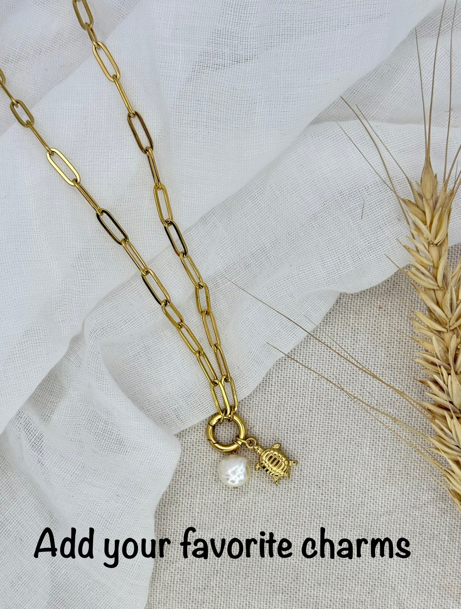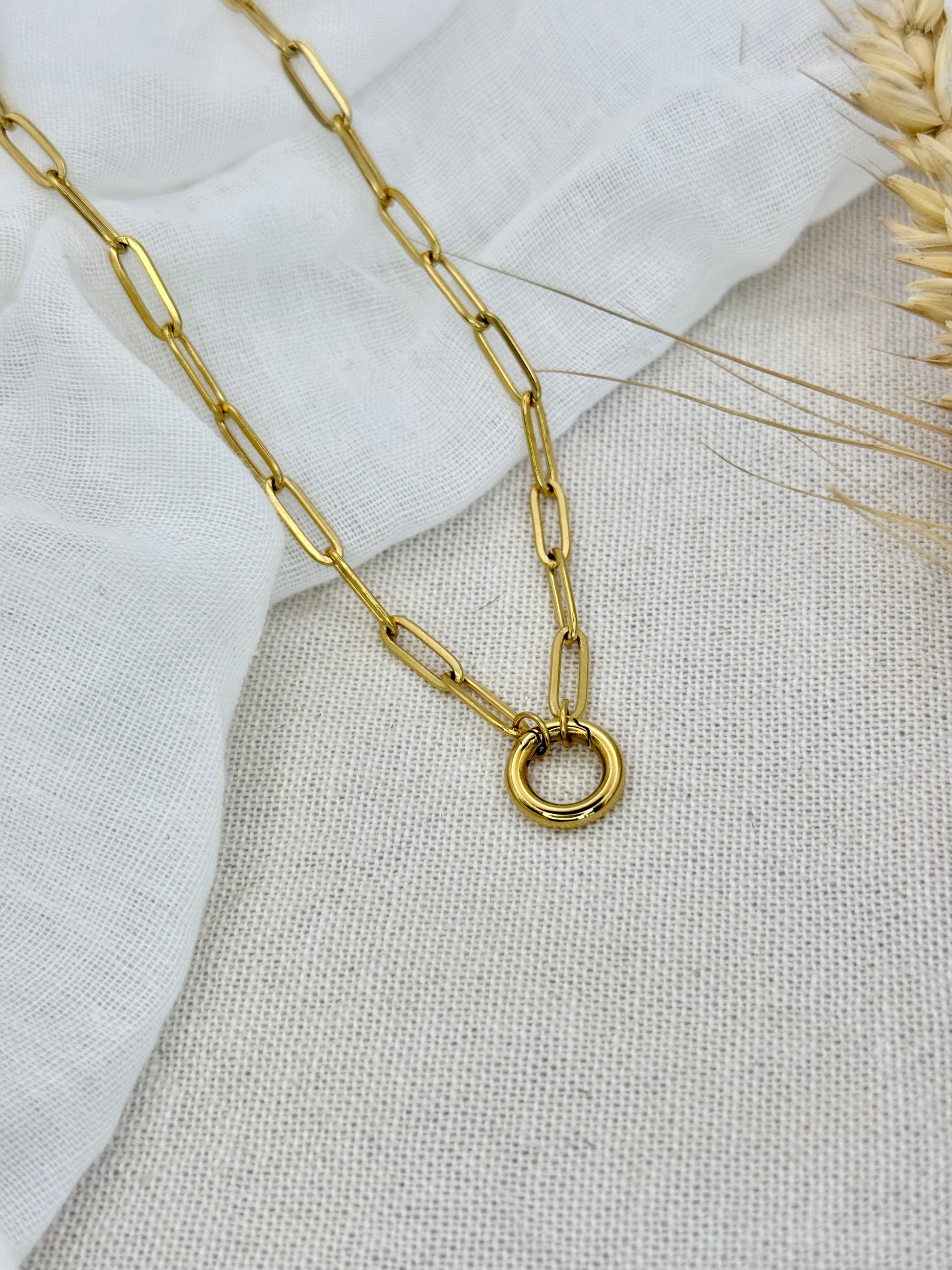 Elevate your everyday look with our 18K Gold Stainless Steel Paper Clip Chain Necklace, crafted with a luxurious PVD gold plating for lasting shine and durability. Designed with a sleek ring clasp, this necklace lets you easily attach and swap charms to match your mood, outfit, or occasion — creating a look that’s uniquely yours.