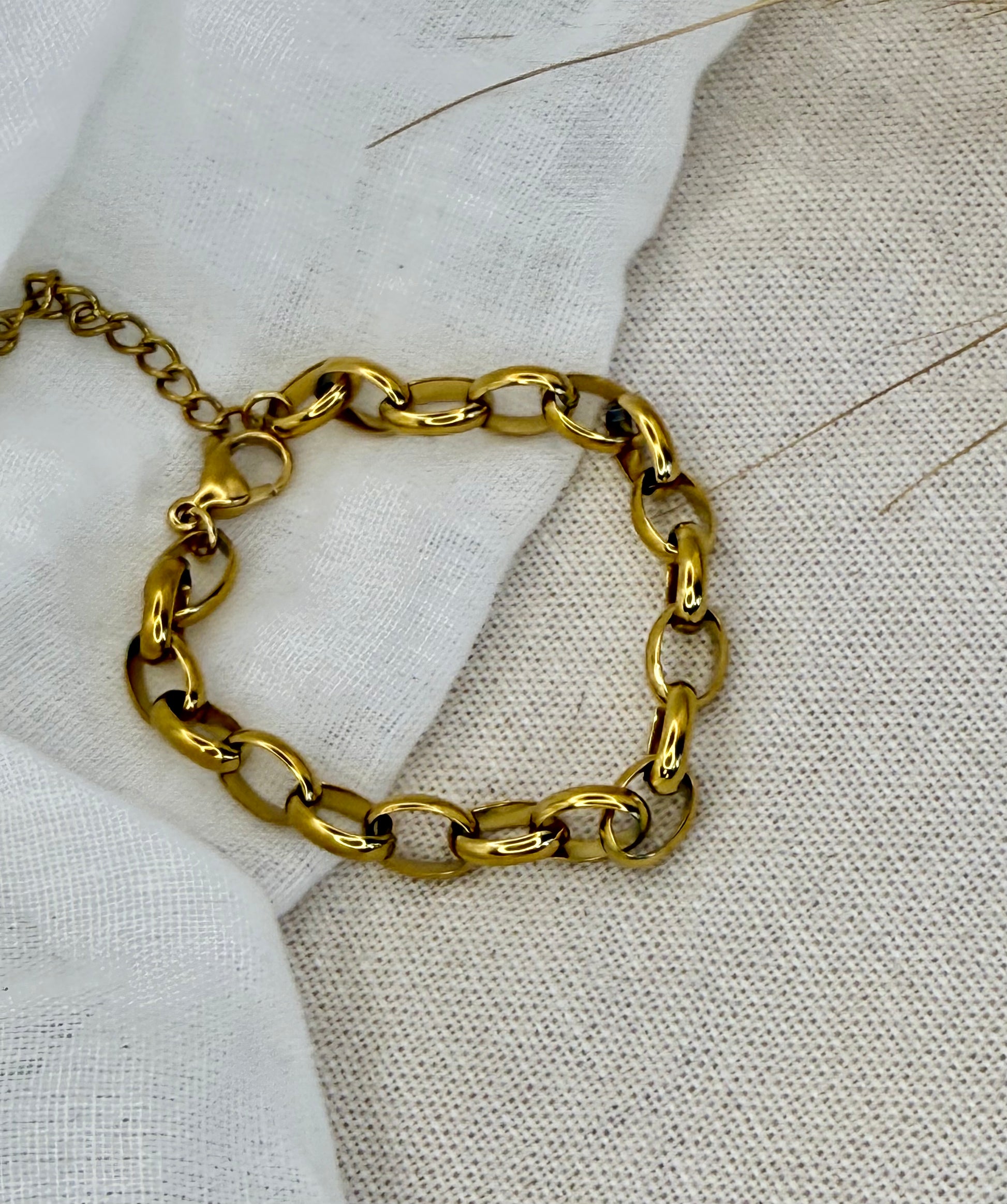 Sleek, versatile, and ready to be personalized, this 18k gold-plated PVD stainless steel flat cable chain bracelet is the perfect base for your favorite charms. Measuring 17cm with a 3cm extension, it offers an adjustable fit for comfort and style.